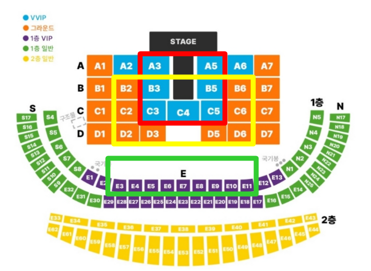 이전에 동일한 장소에서 진행된 콘서트 좌석표를 봤을 때, 추천 좌석은 위와 같습니다. 동일한 가격대라면 가능한 가운데 자리를 잡아 시야를 확보하는 것이 중요합니다.