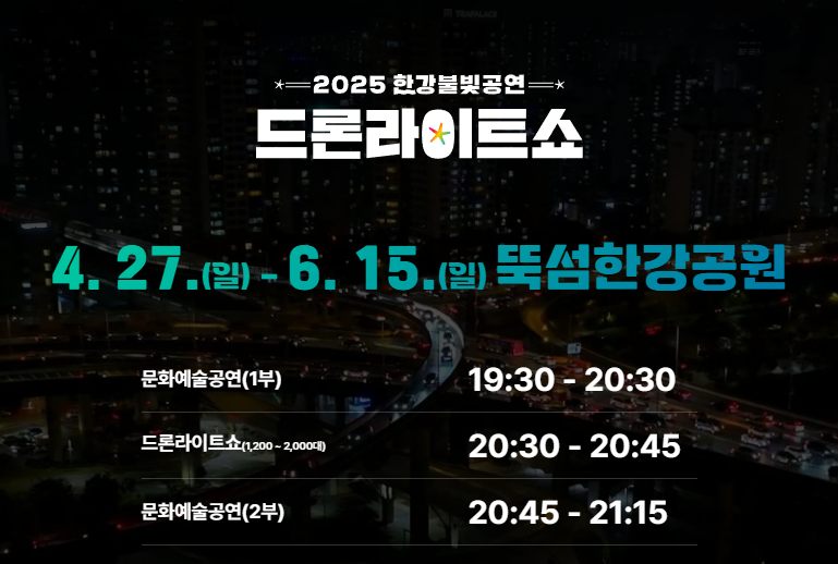 2025 한강 불빛 공연(드론 라이트 쇼)은 서울시가 주최하는 대규모 야간 문화축제로, 1,200대에서 최대 2,000대의 드론이 하늘을 수놓습니다.